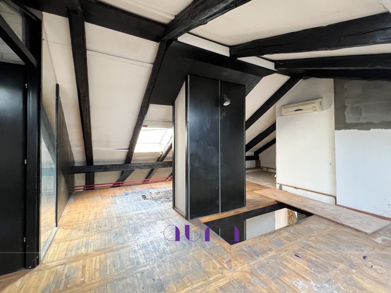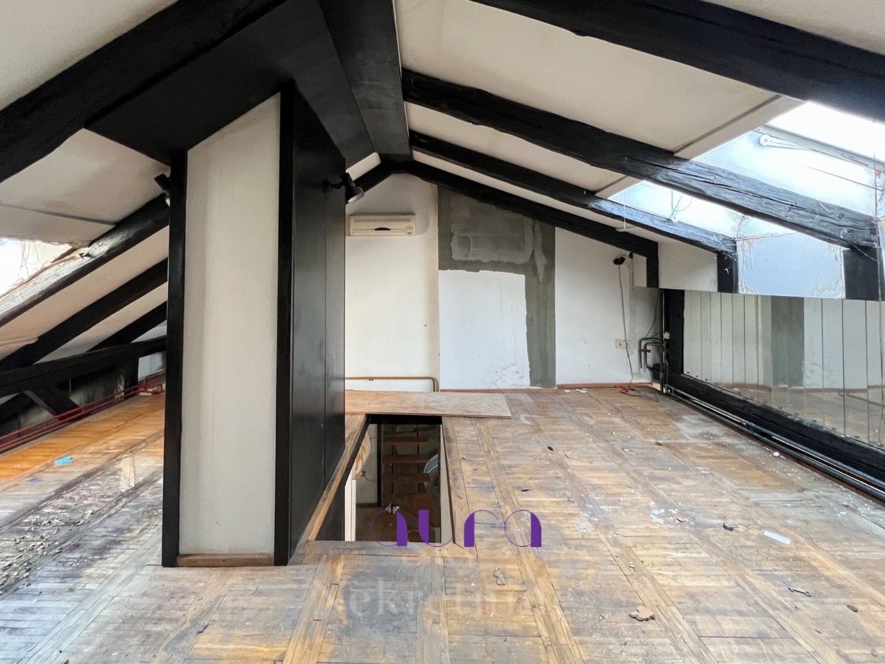 in the city center that has a concrete floor. The floor plans also include a possible proposal for dividing it into two apartments.