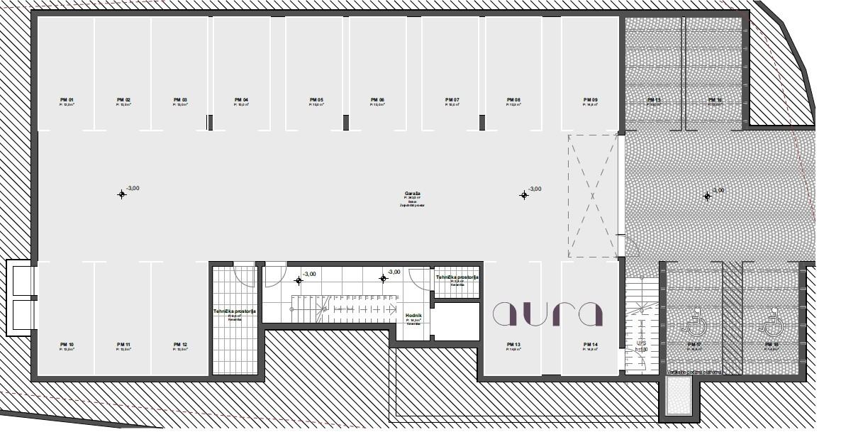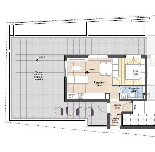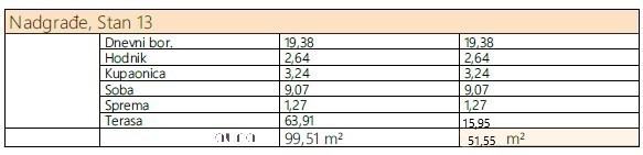 Stan se smjestio na nadgrađu zgrade te se sastoji od hodnika, spreme, kupaonice, open space dnevnog boravka spojenog s kuhinjom i blagovaonicom, spavaće sobe te djelomićno natkrivene terase. Iz dnevnog prostora i spavaće sobe omogućen je izlaz na terasu. Zatvorena površina stana iznosi 35,60 m2, dok se otvoreni dio sastoji od djelomično natkrivene terase površine 63,91m2. Ukupna bruto površina je 99,51m2 a obračunska površina stana iznosi 51,55m2(vidi tlocrt).