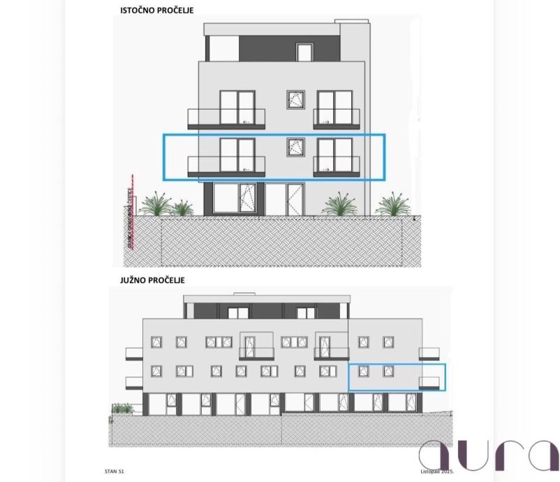 Sastoji se od dnevnog boravka s kuhinjom i blagovaonicom otvorenog tlocrta, dvije spavaće sobe, kupaonice, wc-a hodnika i dva balkona.